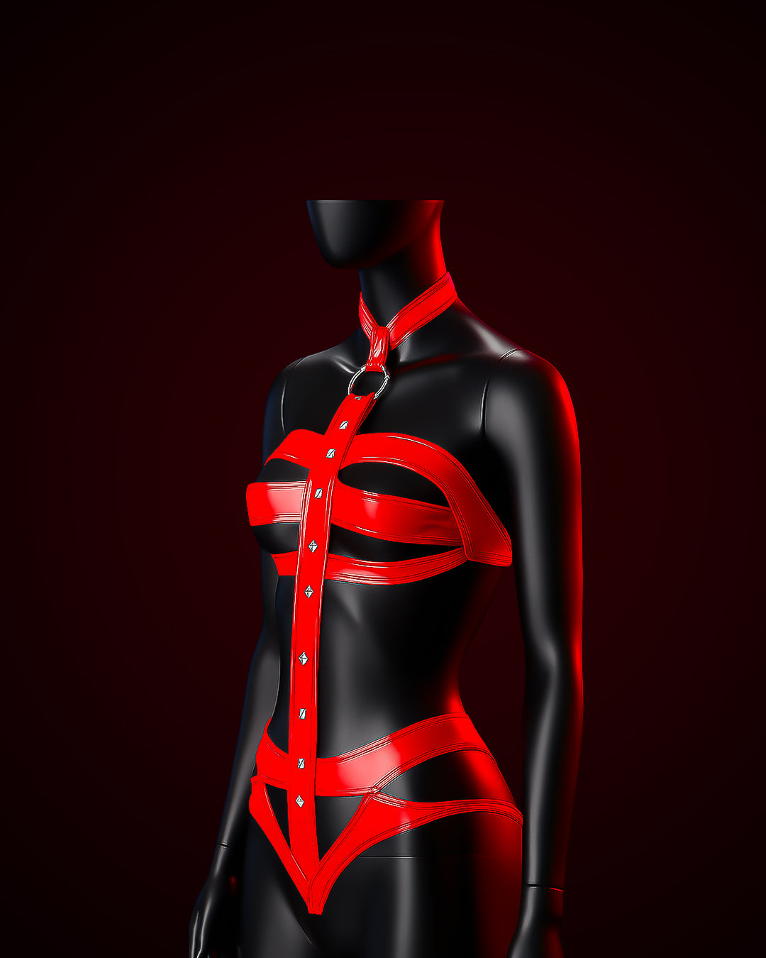 🔥Crimson Desire Red Faux Leather Strappy Bodysuit – Bold Lingerie Harness