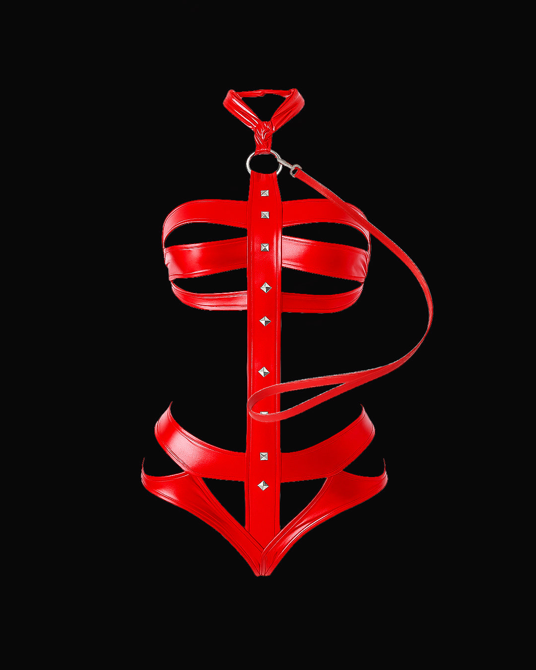 Unleash your daring side with Noir Temptation. Strappy, sleek, and adorned with studs, this black PU leather set sculpts your curves and teases with subtle cut-outs, made to mesmerize.